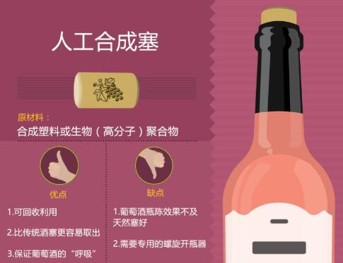 人工合成塞通常是采用合成塑料制品制成的。這種瓶塞是可回收利用的,在外形上和功能上與天然塞相似,都能保證葡萄酒的“呼吸”。一些著名的生產商,如諾馬科(Nomacorc)還推出了采用甘蔗聚合物制成的合成塞。而說到這種瓶塞的不足之處,除了依然需要專門的開瓶器,還有一點是,葡萄酒在瓶中陳年的效果不如天然塞好。