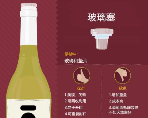 盡管玻璃塞在美國沒有被廣泛采用,但這種瓶塞在歐洲部分地區很受歡迎,如德國和奧地利。這種玻璃塞十分美觀,可回收利用,而且能有效防止葡萄酒氧化。另外,如果一瓶葡萄酒開瓶后還沒飲用完,只需把玻璃塞重新蓋上即可,十分方便。這種瓶塞的缺點是,給葡萄酒增添一定的重量,且成本較高。