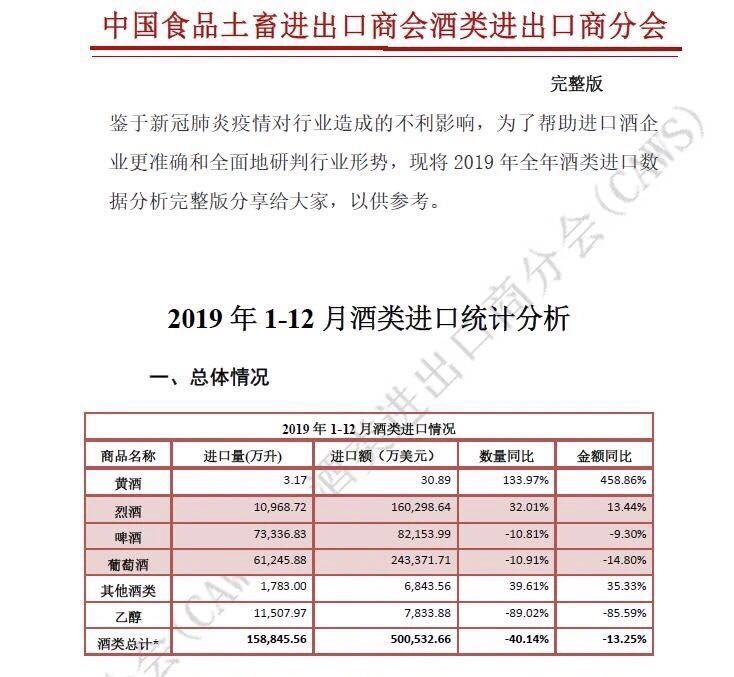 新京報(bào)訊(記者 徐晶晶)2月25日,中國食品土畜進(jìn)出口商會(huì)酒類進(jìn)出口商分會(huì)發(fā)布2019全年酒類進(jìn)口數(shù)據(jù)。2019年1月至12月,全年進(jìn)口量15.9億升,進(jìn)口額50.1億美元,同比(與2018年全年相比)分別下降40.1%和13.3%。主要酒類中,葡萄酒進(jìn)口量同比下降10.9%,烈酒延續(xù)了逆市飄紅,量額增幅略擴(kuò)大。