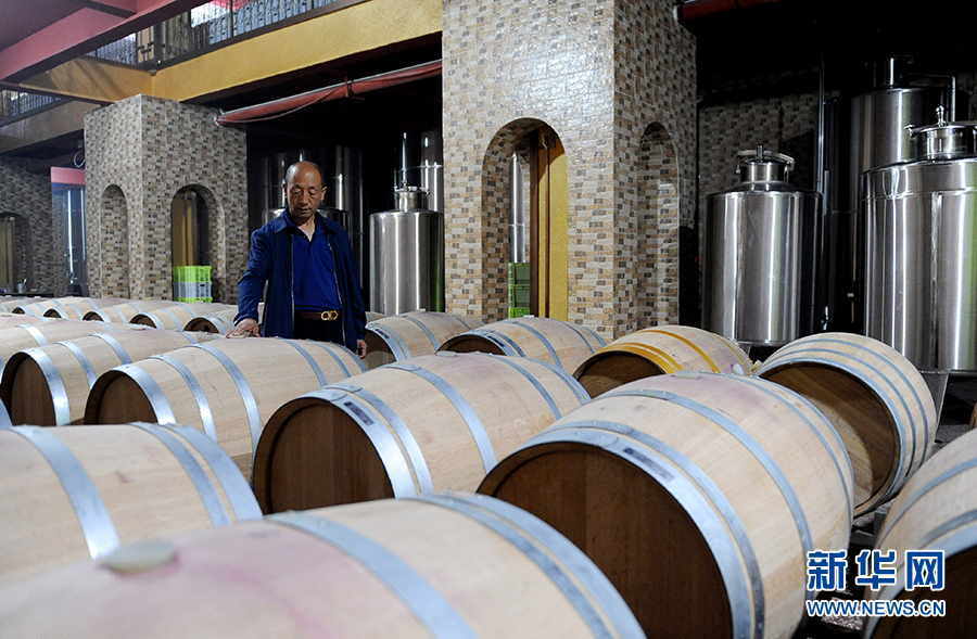 8月21日,吳忠市紅寺堡區東方裕興酒莊工作人員在檢查葡萄酒窖藏情況。近年來,地處賀蘭山東麓的寧夏吳忠市紅寺堡區利用地理位置、土壤、氣候等優勢,大力發展葡萄酒產業,依托“企業+基地+農戶”的合作模式,形成集釀酒葡萄種植、葡萄酒生產、銷售、葡萄酒文化旅游于一體的產業鏈。目前,紅寺堡區釀酒葡萄種植面積10.6萬畝,注冊葡萄酒企業28家,產值達4億元,葡萄酒產業成為當地增收富民的主導產業。
