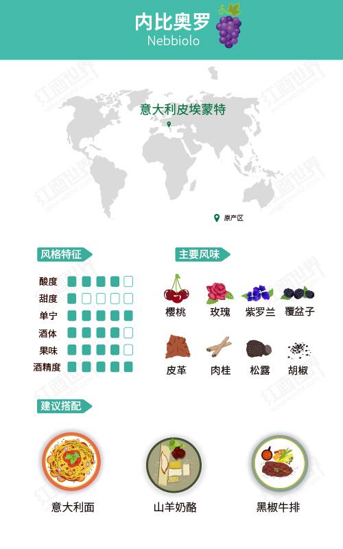 內比奧羅是意大利的本土紅葡萄品種,其故鄉是意大利西北部的皮埃蒙特(Piedmont)產區。內比奧羅之所以被稱為霧葡萄,一是因為其名字的源語言“內比亞(Nebbia)”在皮埃蒙特語中意為“霧”,二是因為內比奧羅葡萄快成熟時,葡萄皮上會形成一層類似薄霧的白霜。