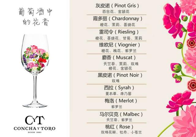 花香的分類和果香的分類非常相似。在白葡萄酒中,白色花朵的香氣比較普遍,而在紅葡萄酒里則較多地能聞到其他的顏色花朵的香氣。以下是一些含有花香分子的葡萄品種,這些品種釀造的葡萄酒可能聞到的花香。