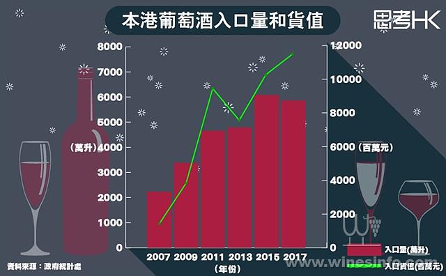 葡萄酒振興香港經濟?港府在2008年豁免葡萄酒稅,并銳意發展為區內貿易及分銷中心。香港的葡萄酒入口量持續上升,由2007年的2238萬升,增至2017年的5859萬升,增幅1.6倍,入口葡萄酒的價值由14億元,飆升至近115億元,十年間增加近7倍。