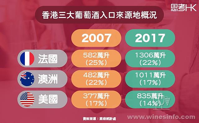 法國的葡萄酒名聞遐邇,亦是香港入口最多葡萄酒的來源地,去年就入口了1306萬升,佔整體入口量的22%。其次是澳洲,佔17%,美國的紅酒亦佔14%。三甲排名與2007年一樣,但佔整體入口比例均有下降,因為香港入口葡萄酒的地區或國家,已由2007年的42個增至去年的62個,葡萄酒來源地更多元化。